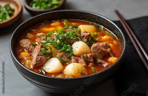 Hearty bowl of stew featuring tender meat and vegetables garnished with green onions