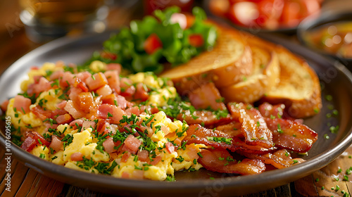 Hearty Breakfast Plate with Eggs, Bacon and Toast