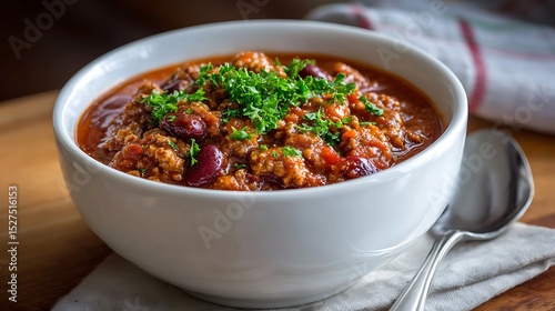 Hearty Chili in a White Bowl Topped with Fresh Herbs