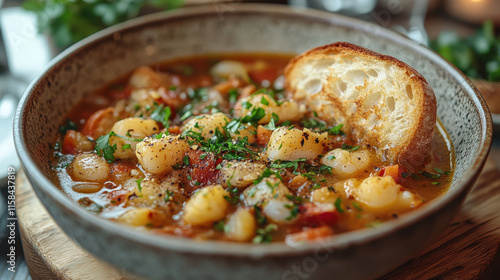 Hearty Chunky Soup, Rustic Dark Metal Bowl, Wooden Table, Cozy Interior, Restaurant or Home Kitchen