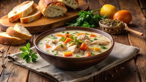 Hearty, comforting bowl of creamy chicken soup with tender pieces of poultry, fresh vegetables, and crusty bread for dipping on a rustic wooden table.