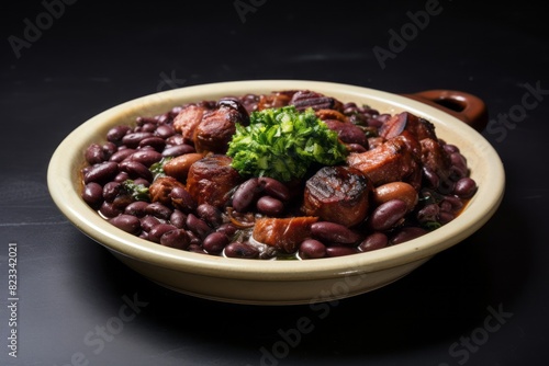 Hearty feijoada on a ceramic tile against a white marble background