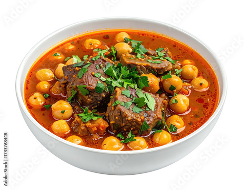 Hearty stew with chunks of meat, chickpeas, and herbs, in a white bowl