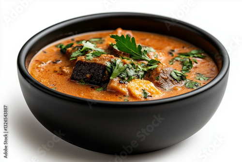Hearty stew with tender beef and fresh herbs served in a black bowl
