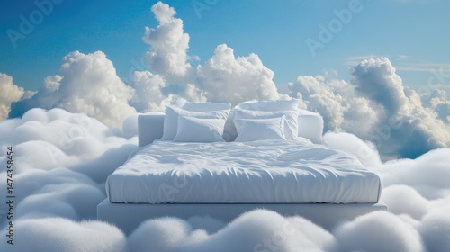 Heavenly bed with billowing linens merging seamlessly into cloudscape, concept of ultimate comfort