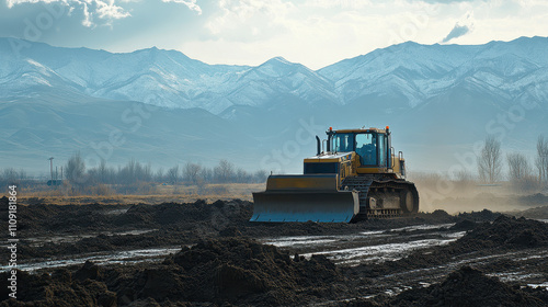 Heavy Construction Equipment Concept, Bulldozer with Wide Metal Blade Pushing Soil in Mountainous Terrain Under Cloudy Sky