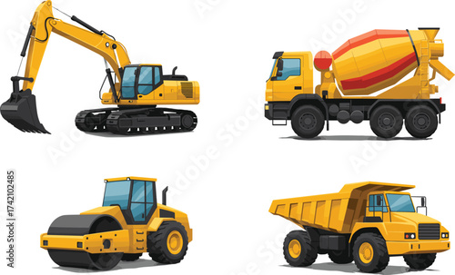 Heavy construction vehicles illustration with excavator, cement mixer truck, road roller, and dump truck, industrial machinery equipment for building projects