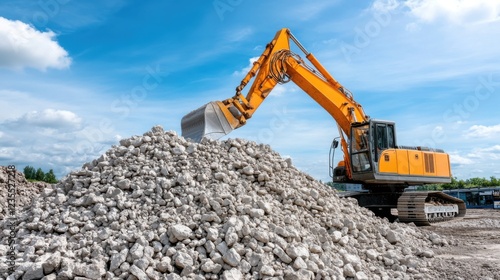 Heavy Excavator Loading Gravel at Construction Site Under Bright Blue Sky with White Clouds