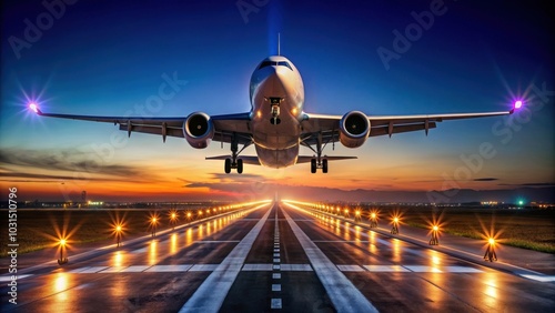 Heavy jet airliner landing at night under a clear sky, aircraft, airplane, landing, night, sky, stars, transportation, travel