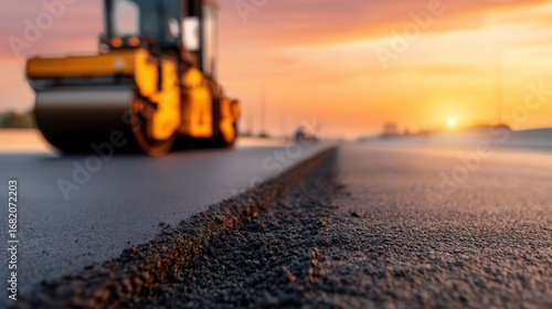 Heavy Machinery Compacts Asphalt During Sunset on a Construction Site