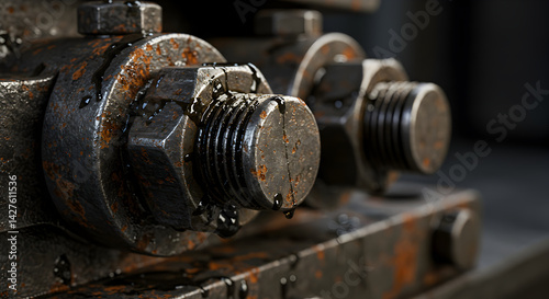 Heavy Machinery Fasteners With Visible Wear And Lubrication Close Up