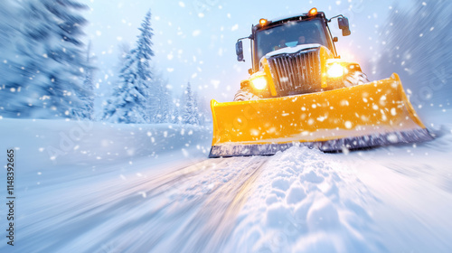 Heavy snow plow clears road during winter storm