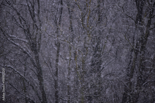 Heavy snowfall in the forest. Large snowflakes falling on the ground in winter