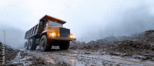 heavy truck mining concept. Heavy dump truck navigating through muddy terrain in foggy conditions.