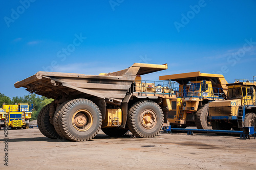 heavy yellow quarry dump truck at repair station at sunny cloudless day