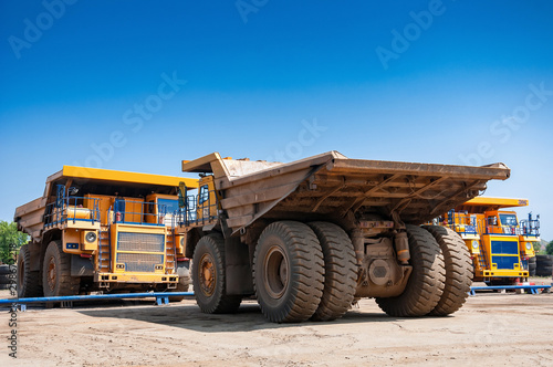 heavy yellow quarry dump truck at repair station at sunny cloudless day