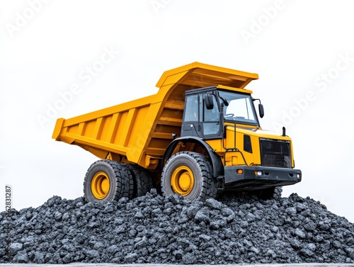 Heavy-duty dump truck on a pile of dark gray aggregate