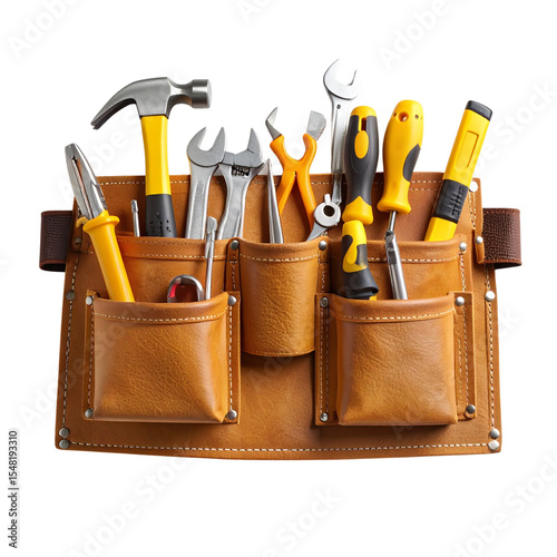 Heavy-Duty Leather Tool Belt Fully Equipped with Hand Tools, Isolated on White Background