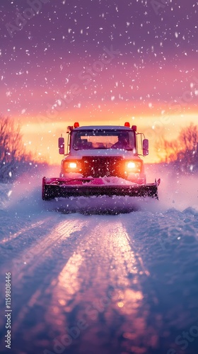 Heavy-duty snowplow clearing highways after a winter storm, ensuring safety, illustrated in a realistic, high-contrast art style