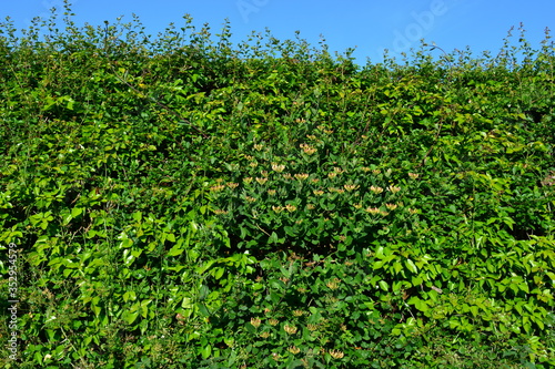 Hedgerow detail with wild honeysuckle, also known as Lonicera periclymenum