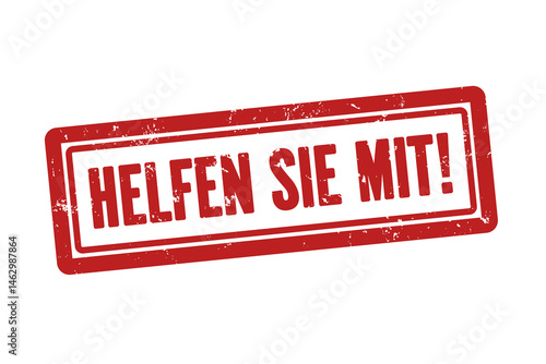 Helfen Sie mit (Help us) - A red stamp, isolated on white background.