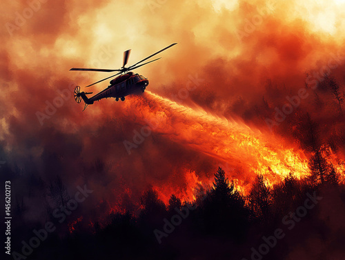 Helicopter battling raging wildfire amidst thick smoke and flames