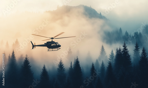 Helicopter Crossing Over a Misty Forest at Dawn, Capturing the Serene Early Morning Scene
