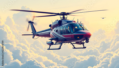 Helicopter Flying Above Clouds at Sunset Scenic Aerial View