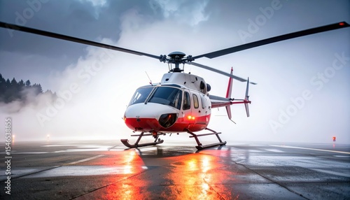Helicopter on Heliport in Fog with Rotating Blades and Flickering Lights