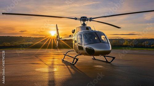 Helicopter parked on helipad at sunset with bright horizon Generative AI