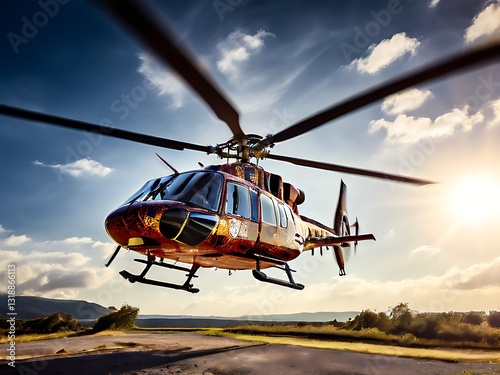Helicopter Taking Off in a Dramatic Golden Sky