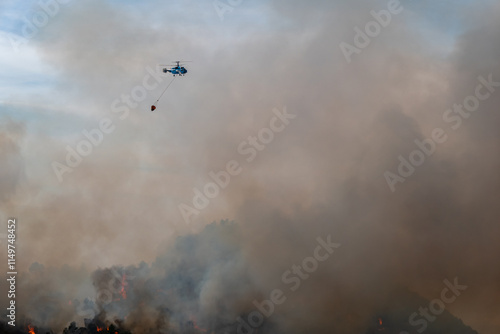 Helicóptero no combatendo a incêndio florestal em meio a densas nuvens de fumaça