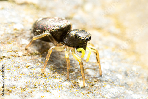 Heliophanus flavipes sur poubelle jaune, araignée en gros plan