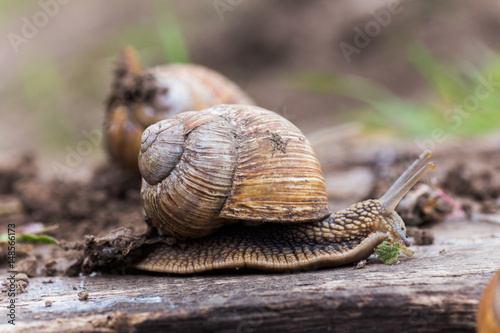 Helix pomatia, or Burgundy snail, Roman, edible or escargot crawls on a wooden board. The snail stuck out its antennae.