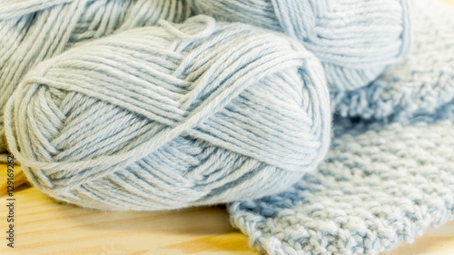 Hellblaue Wolle mit angefangenem gestricktem Stueck und Nadeln