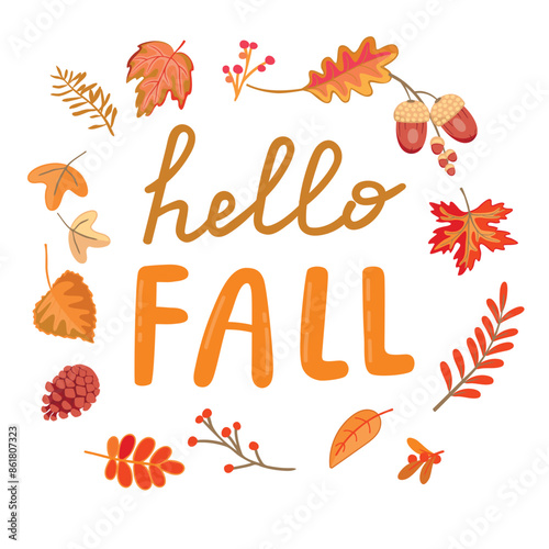 Hello Fall poster with autumnal foliage,twig with red berries,acorns, pine cone.Colorful background with hand lettering and gifts of nature.Vector design for use in card,banner,printing on fabric.