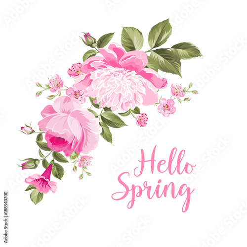 Hello spring card with purple roses. Spring flowers bouquet of color bud garland. Label with rose flowers. Vector illustration.