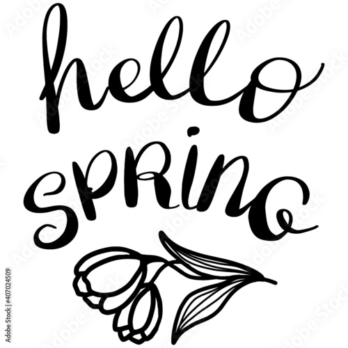 Hello spring vector. Lettering. Typography with flower. Greetings phrase.Phrase "Hello spring". Isolated Illustration on white background. Seasonal greeting. Hand drawn phrase