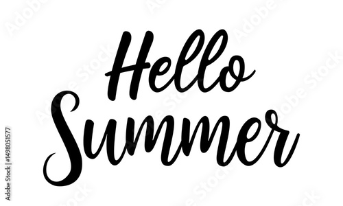 Hello Summer handwritten calligraphy phrase in modern brush lettering style, black typography on white background for seasonal greeting cards, posters, prints and invitations