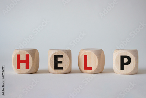 Help symbol. Concept word help on wooden cubes. Beautiful white background. Business and help concept. Copy space.