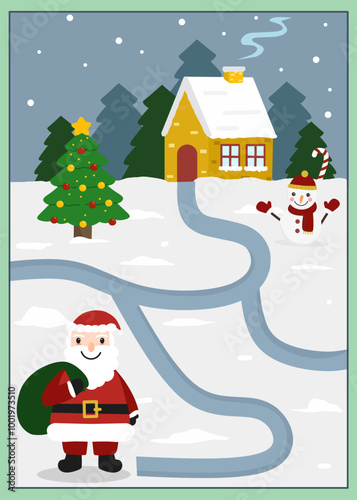 Help the santa claus find the right way to the house, santa claus maze for kids, christmas labyrinth worksheet for kindergarten