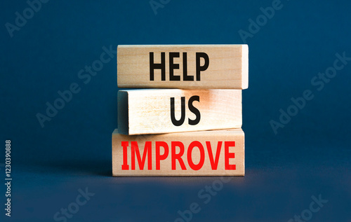 Help us improve symbol. Concept words Help us improve on beautiful wooden blocks. Beautiful grey table grey background. Business motivational help us improve concept. Copy space.