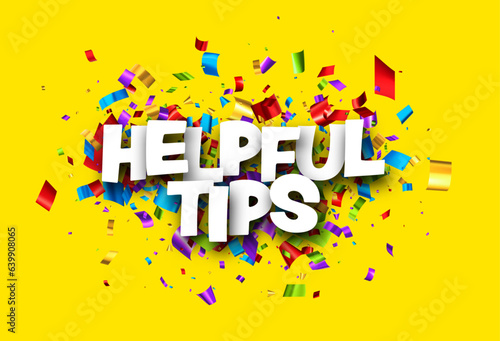 Helpful tips sign with colorful cut out foil ribbon confetti on yellow background.
