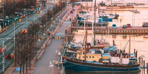 Helsinki, Finland. View Of Pohjoisranta Street And Ships, Boats And Yachts Moored Near Pier In Evening Time