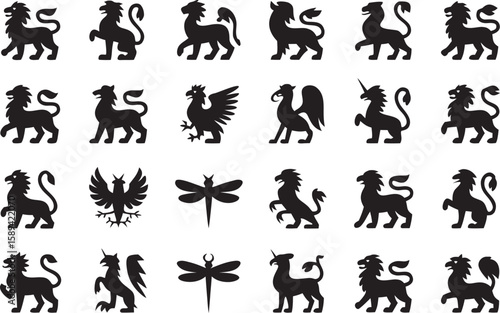 Heraldic Griffin Silhouette with Wings Spread on White Background mythical creature