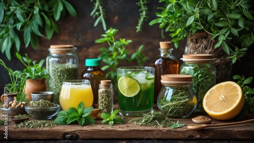Herbal Drink Collection with Fresh Ingredients in Jars on Rustic Table Background Healthy Lifestyle Concept with Natural Herbs and Empty Space
