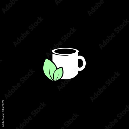 Herbal green tea cup, green leaf with tea cup icon isolated on black background