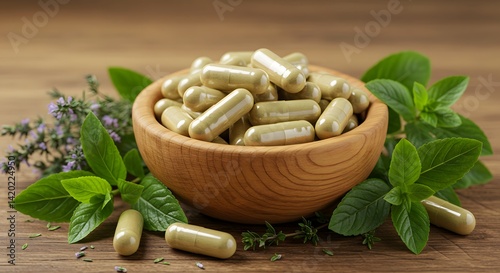 Herbal medicine capsules in wooden bowl with fresh herbs on wood table