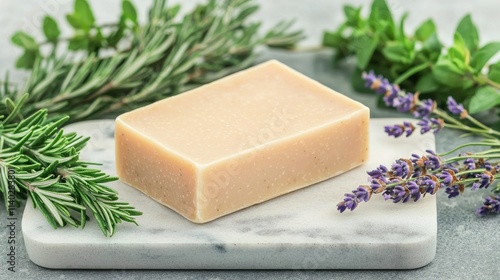 Herbal Soap on Marble Tray Surrounded by Fresh Herbs