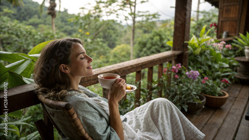 Herbal Tea Moment - A woman enjoying a cup of herbal tea on a wooden balcony with plants in the background.